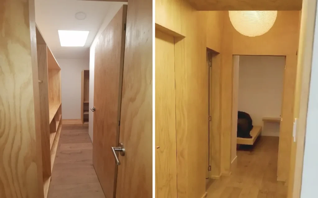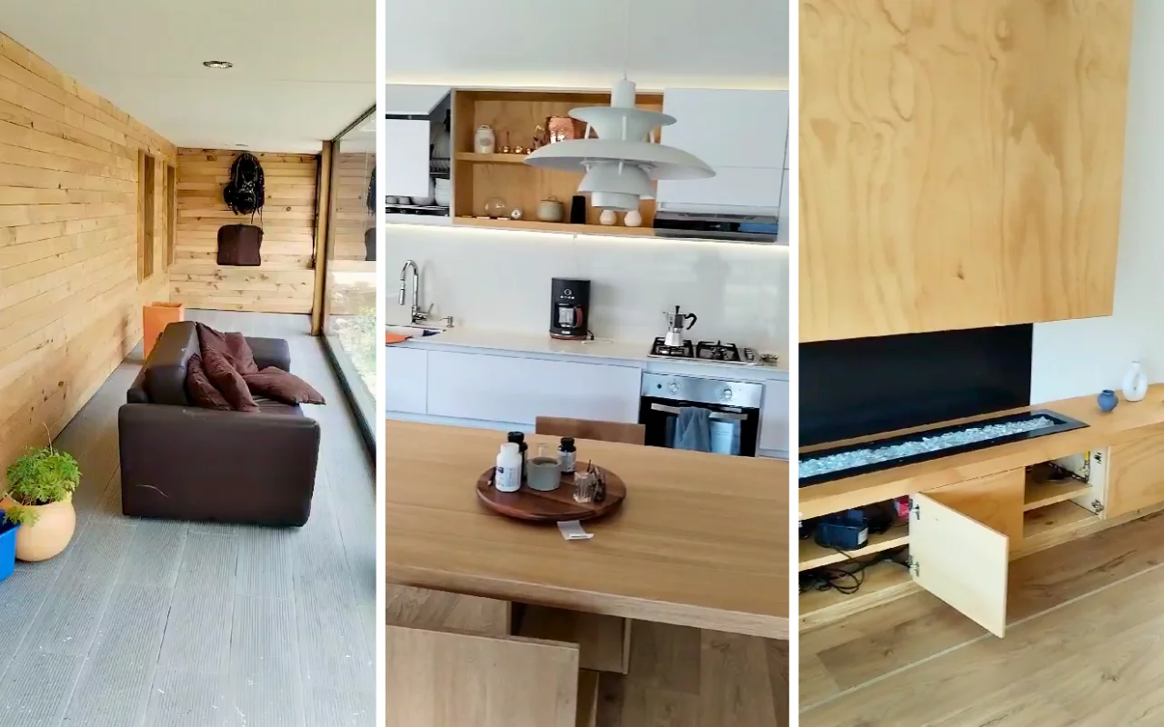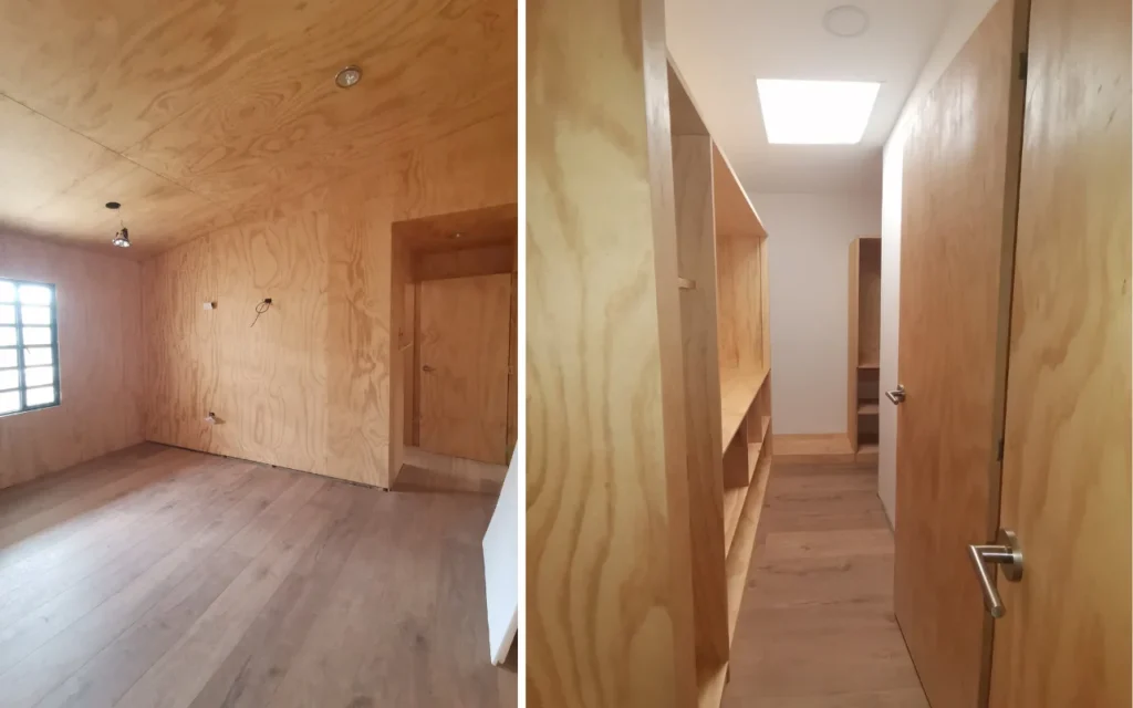 Diseño y construcción de una casa de dos recamaras con un tejado de 4 aguas, sala, comedor y lavandería. Con un estilo moderno de cabaña contemporánea, destacando la madera como elemento principal en pisos, paredes y armarios.